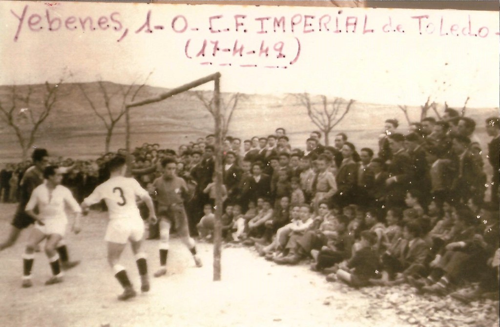 Antiguo campo de fútbol de tierra el 17 de abril del 49, jugando contra el Toledo Imperial C.F. Resultado favorable para nuestra localidad, como podemos ver escrita en la foto por el creador de la misma.