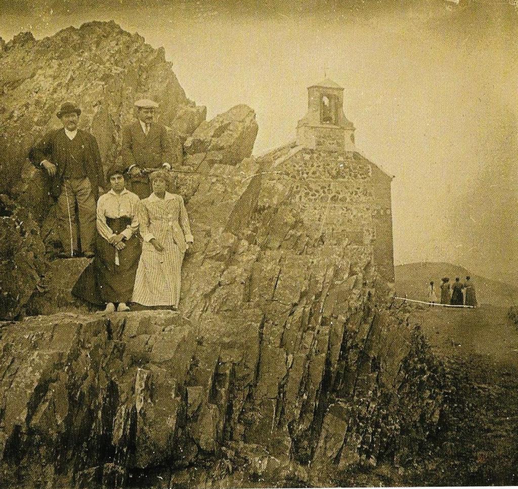 Dos parejas posan junto a la Ermita de nuestro patrón San Blas de fondo. Podemos deducir por sus ropajes, por el reloj de bolsillo que tiene el hombre de la izquiera y la escopeta ques sostiene el otro, que son de una familia de señores y que pertenecen a una clase alta.