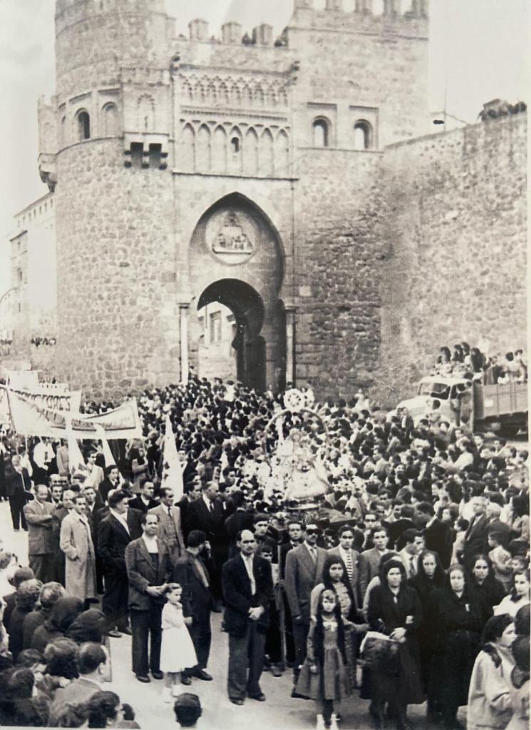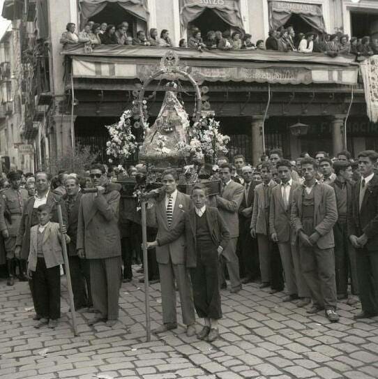 En la segunda foto vemos acompañando a la imagen paisanos, que descienden la calle real del Arrabal a la altura de la puerta del Sol.