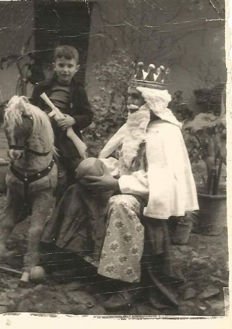 Retrato de Salvador Martín Jimenez junto al rey Gaspar, recibiendo sus regalos el día de reyes.